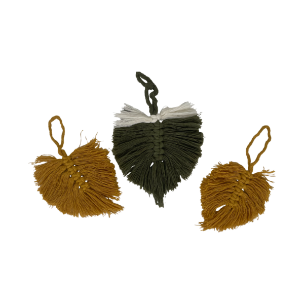 Zawieszki w kształcie listków – to małe ozdoby z makramy w tylu boho. Mały element nadający miękkości i charakteru zarówno przedmiotom, jak i wnętrzom.
